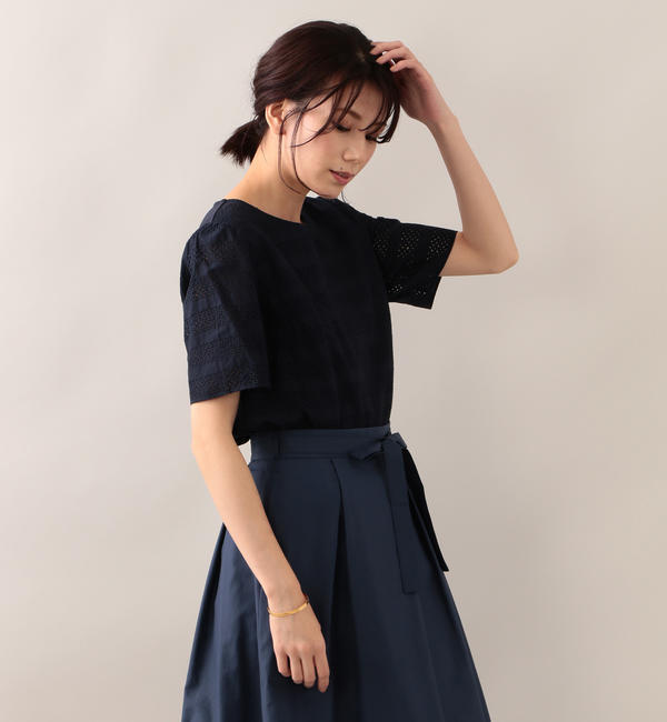 後ろ身頃はジャージー素材を使用し、着心地よく仕上げました。レースの柄を生かしたシンプルなデザインなので合わせるボトムやアウターを選ばず、幅広く活躍します。インナーなどにも使いやすい一枚です。【素材】レース部分は、ドット柄を表現したコットンローンレースを使用しています。編地部分は、超長綿を使用したソフトで肌触りの良い素材です。艶のあるきれいな表情が特徴です。※家庭洗濯可能です。 マッキントッシュフィロソフィー ・ エムピーストア/MACKINTOSH PHILOSOPHY ・ MP STORE MACKINTOSH PHILOSOPHY|トップス|Tシャツ・カットソー