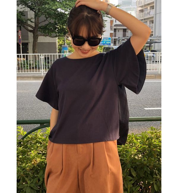 しっかりとした綿天竺と、ヴィンテージサテンを切替えた異素材使いのカットソーです。 少しボックスシルエットで、フレアスリーブになっているのが今年らしいシルエットです。【スタイリング】バックプリーツがポイントなので、パンツスタイリングで前裾のみウエストにインして合わせるのがお勧めです。 マーキュリーデュオ/MERCURYDUO トップス|Tシャツ・カットソー