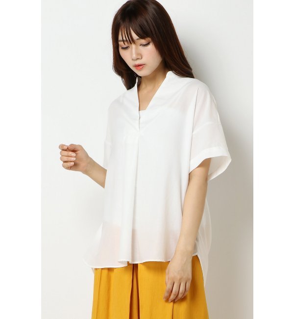 [アイテム説明]フロントはスキッパーネックでビジネスシーンでも使えるスタイリッシュなデザイン。後ろは大きなタックとボタンデザインでボリュームを出し、密かに遊び心を添えました。袖はロールアップしてアクティブな雰囲気で着て頂くこもできます。シワになりにくい素材でお手入れラクチン。無地はUV加工しています。[洗濯表示]洗濯機洗い可(弱く)、ドライクリーニング可(F)、ウェットクリーニング(W) イッカ/ikka ikka|トップス|シャツ・ブラウス