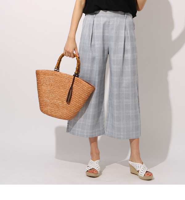抗菌防臭のポリジン加工を施したこれからの季節に便利なアイテム。生地の織り方でチェック柄を立体的に表現したワイドクロップドパンツ。ウエストの後ベルトはゴムの仕様になっていて、フロントにはボックスタックを入れているので、楽に履けて腰周りもカバーするデザイン。同色の糸を使い無地見えのするチェックと、配色チェックの展開です。主に夏に着用いただける商品です。 ザ ショップ ティーケー/THE SHOP TK THE SHOP TK|パンツ|その他