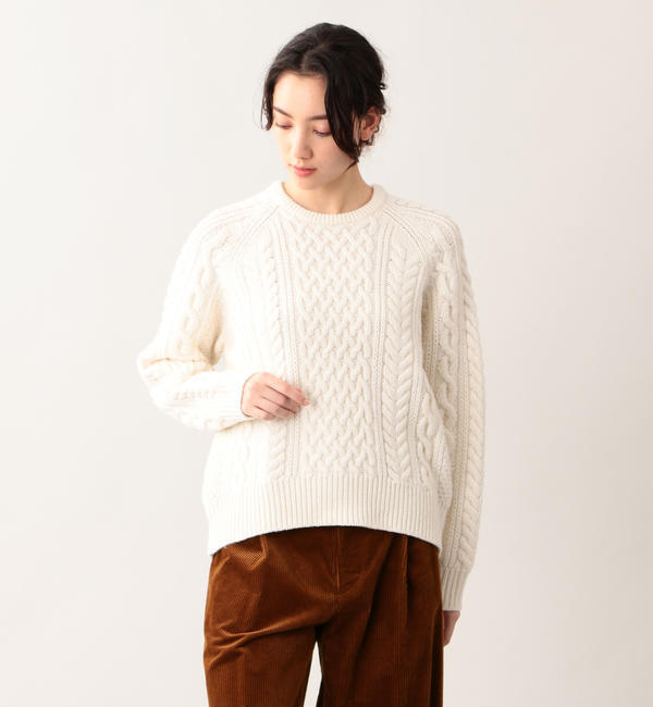 <立体的なケーブル柄が暖かみのあるニット>【デザイン】少しゆったりとしたシルエットでやわらかい印象に仕上げています。定番のトップスなので合わせやすく、着まわしが良いニットです。【素材】上質なラムウールをブレンドした素材です。ナイロン混で柔らかく、チクチクしにくく、保温性に優れています。ローゲージで編み、しっかりと存在感のある肉感のニットです。モデル:170cm B:78cm W:59cm H:88cm 着用サイズ:2 マッキントッシュフィロソフィー ・ エムピーストア/MACKINTOSH PHILOSOPHY ・ MP STORE MP STORE|トップス|ニット・セーター