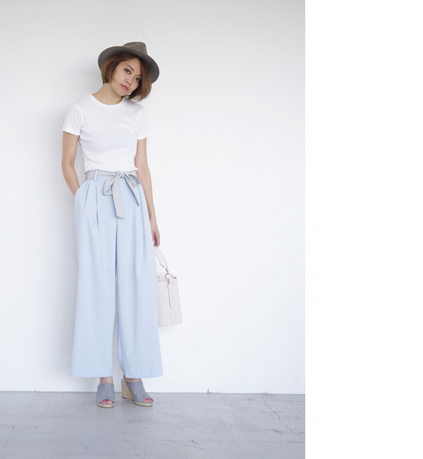 ボリュームのあるタックワイドパンツは、ウエスト位置をジャストにすることによりすっきりとした印象に。また、ウエストのリボンベルトで大人可愛いアクセントをつけました。ミニマル感を楽しむならコンパクトなトップス合わせでメリハリのあるコーディネートがおすすめ。※サックスはグレーの配色ベルトです。 トウキョウ スタイリスト ザ ワン エディション/TOKYO STYLIST THE ONE EDITION パンツ|その他